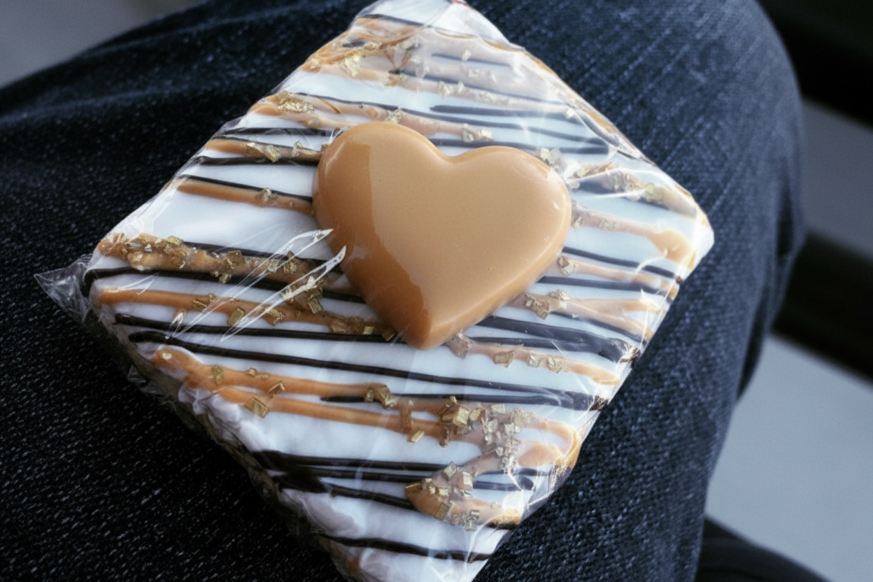 A nostalgic favorite elevated with indulgence. Thick, buttery homemade Rice Crispy treats are dipped in smooth chocolate and finished with Valentine's detailing for a soft, decadent bite.